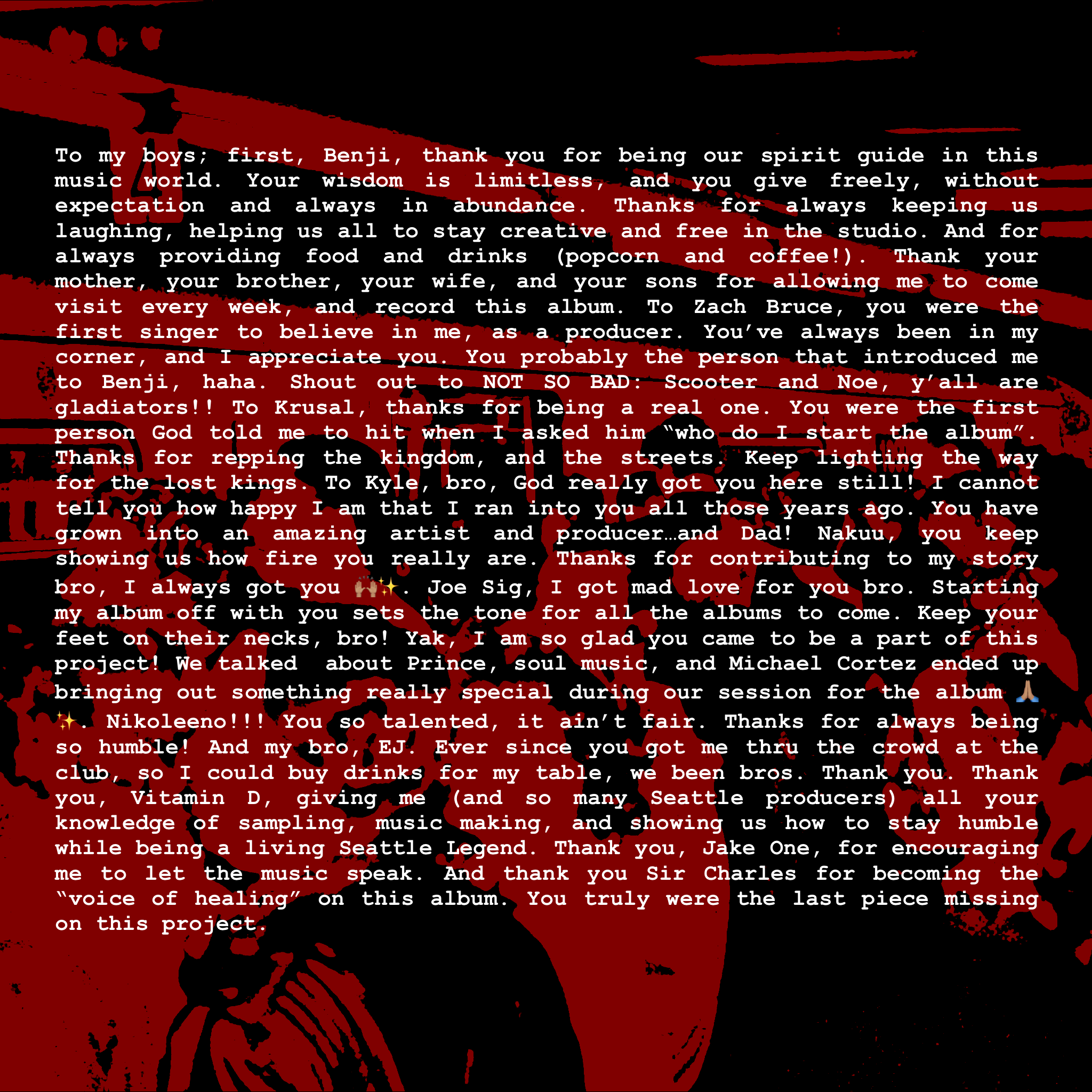 Below is the list of artists featured on the album, in the order that they appear. (Sir Charles is “the voice of healing” on the intro, interlude, and outro).